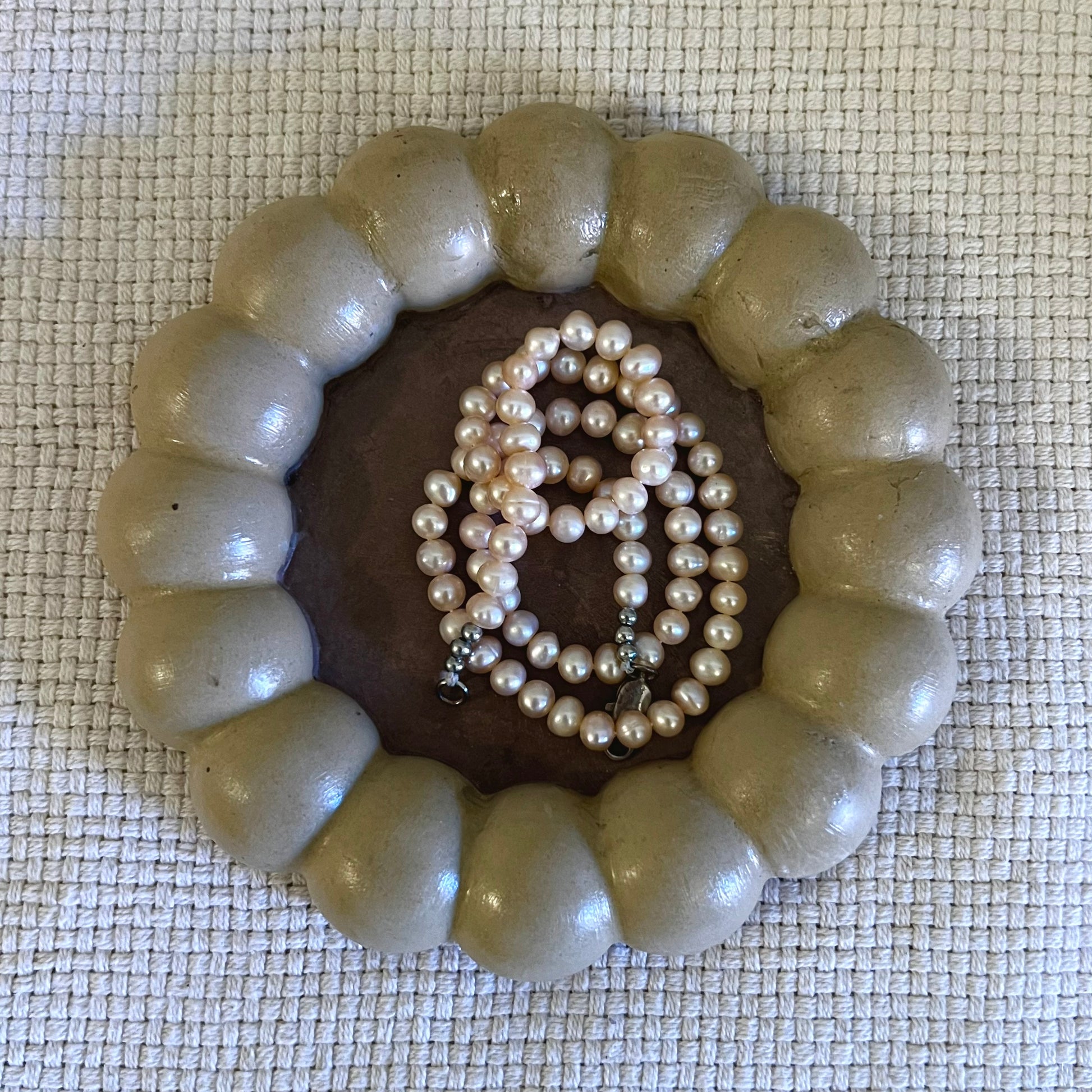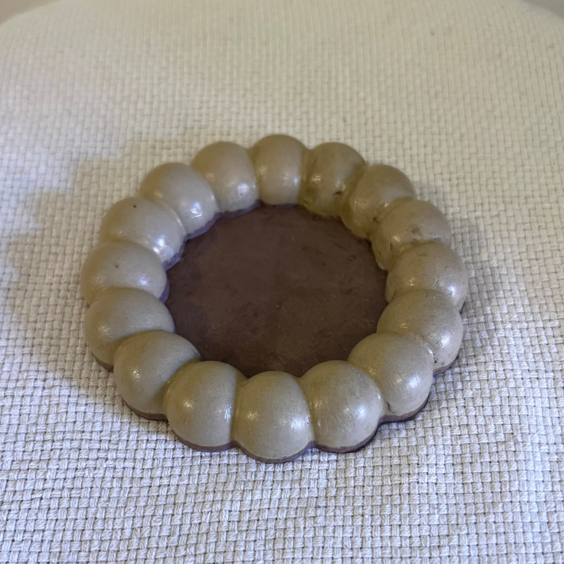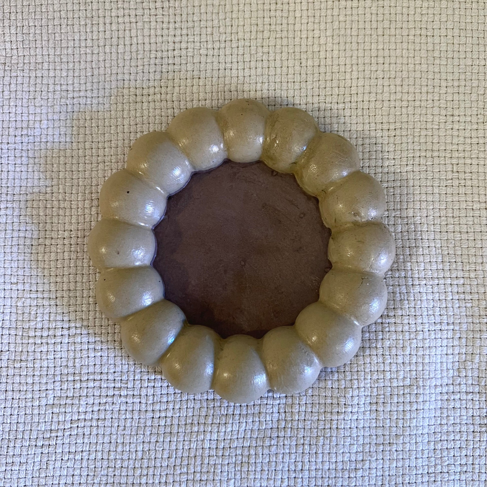 Ručno izrađen okrugli betonski pladanj s dekorativnim bubble uzorkom s vanjske strane kruga. Sastoji se od dvije boje, tamno i svijetlo smeđe.