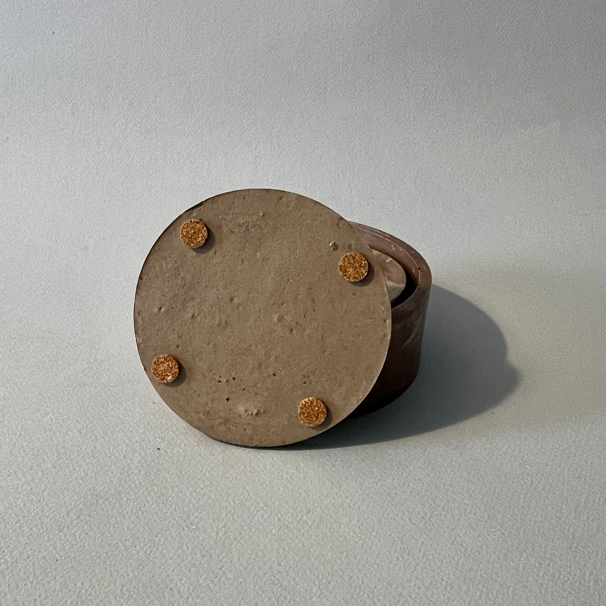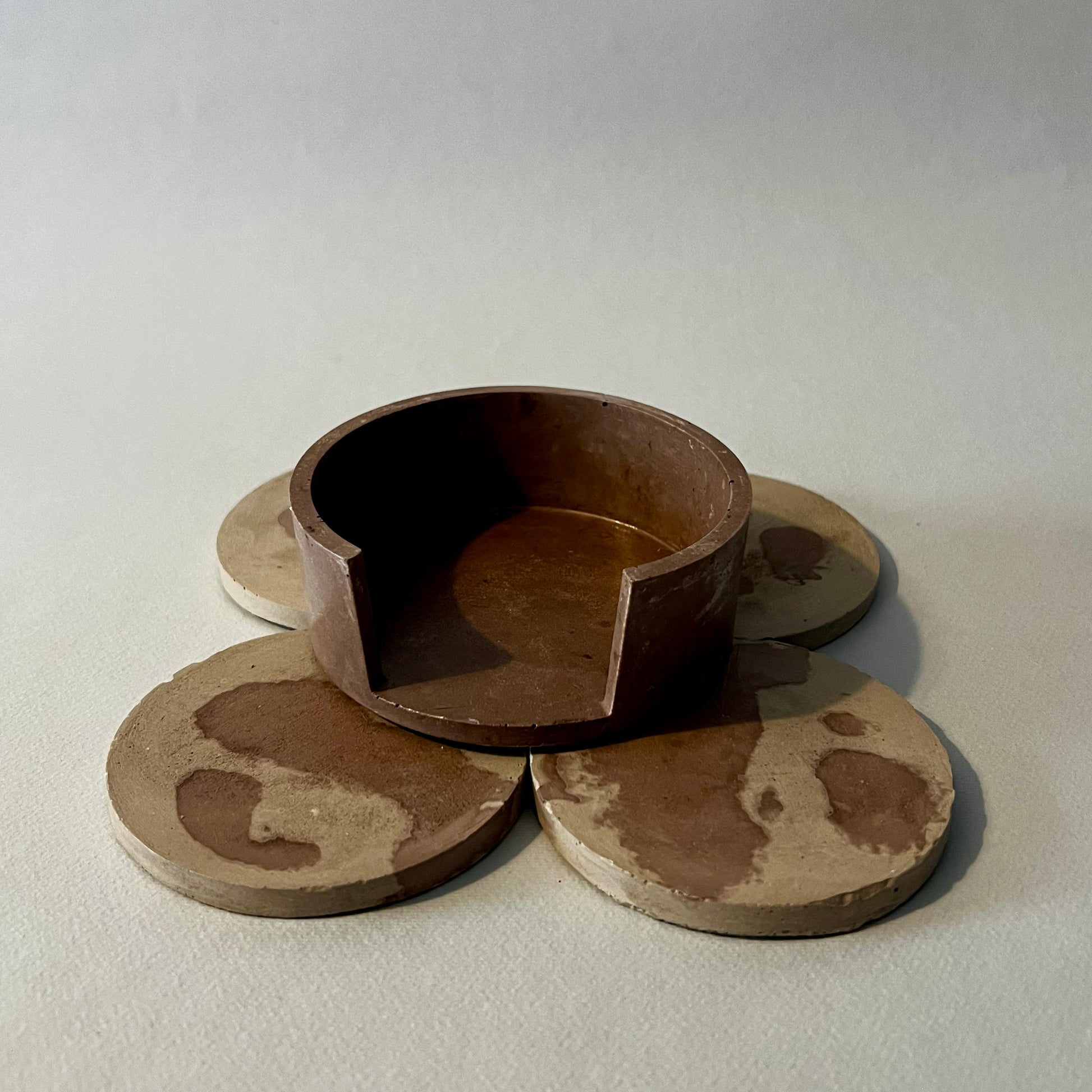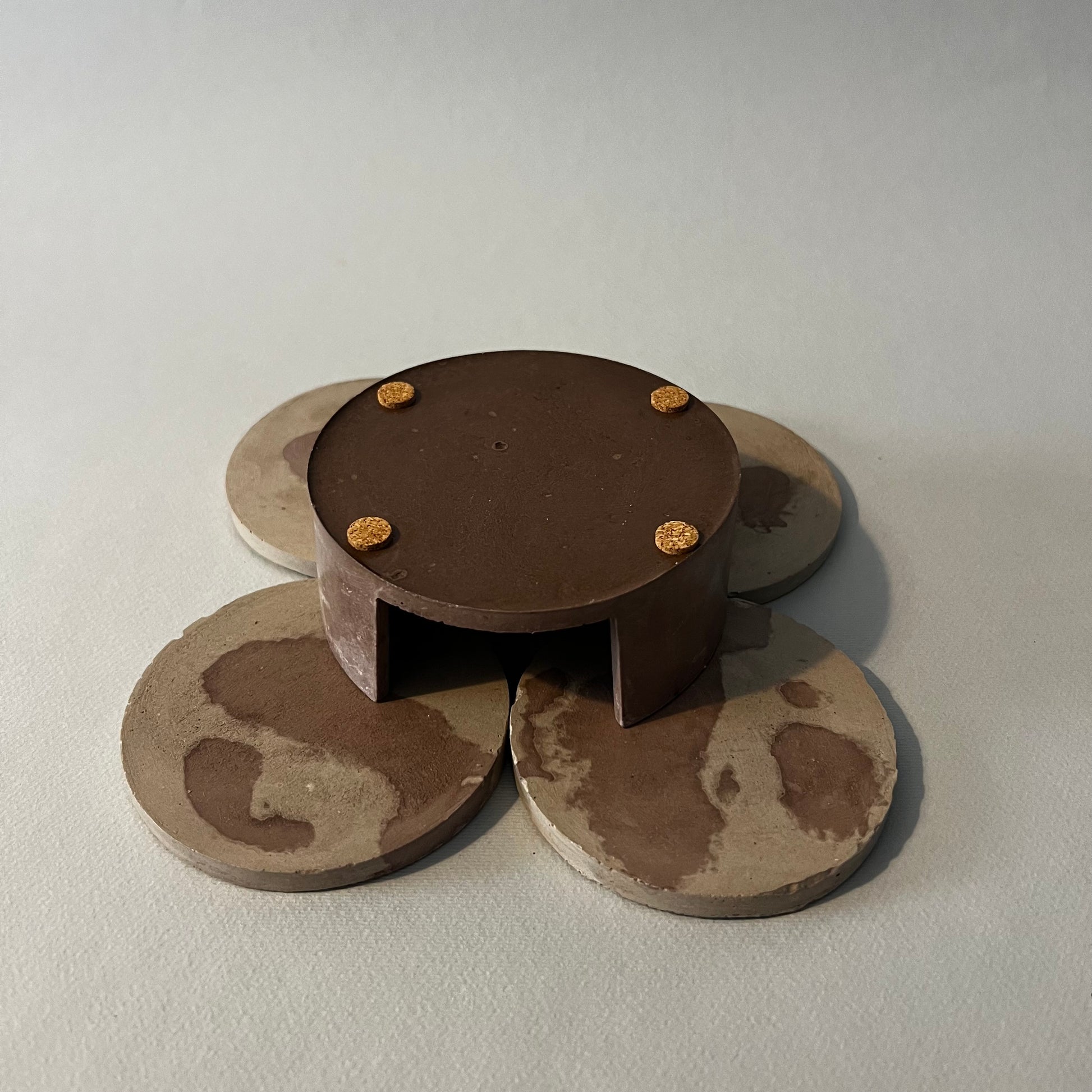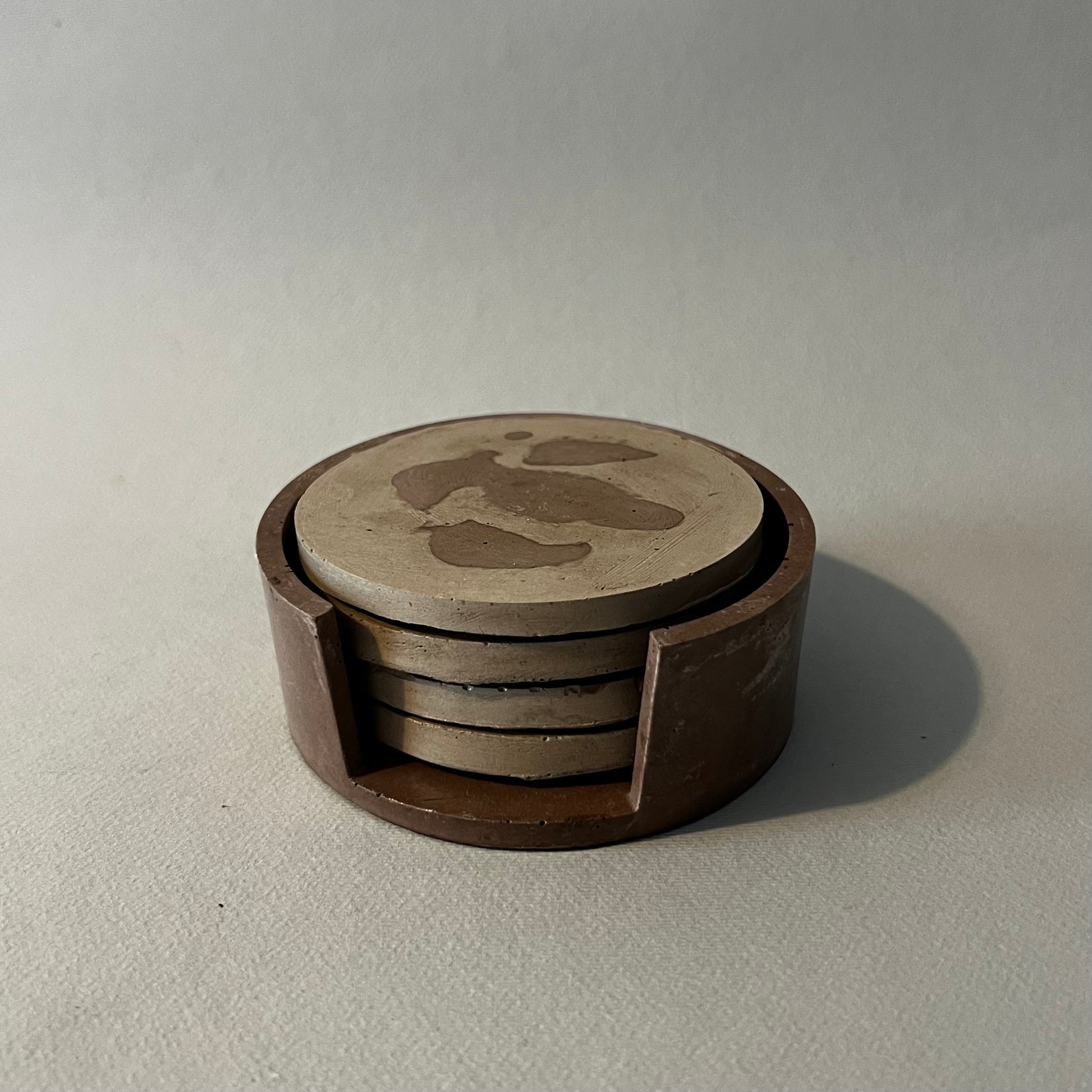 Komplet se sastoji od 4 betonska podloška i pripadajućeg držača, izrađenih ručno od kvalitetne betonske smjese. Svaki podložak ima jedinstven uzorak i nijansu, što setu daje poseban karakter.