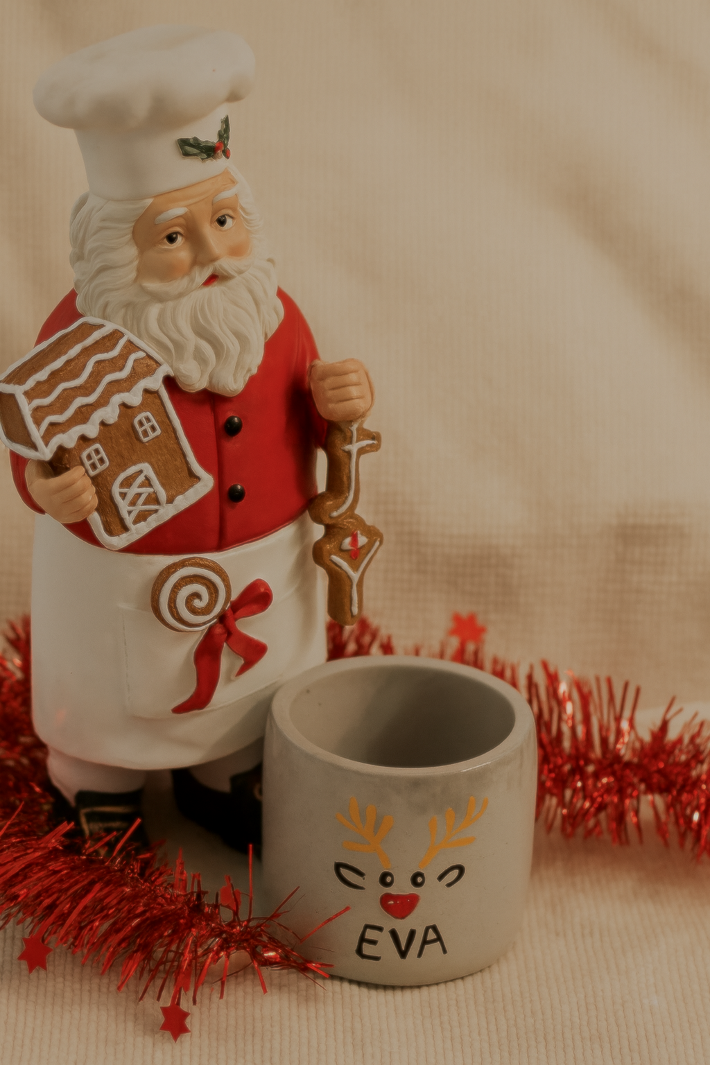 Svaka posudica izrađena je od betona i ručno oslikana Božićnim motivima, a na njoj možemo ispisati ime po vašoj želji, idealno za djecu, prijatelje, obitelj ili kao mali znak pažnje uz poklone pod borom.
