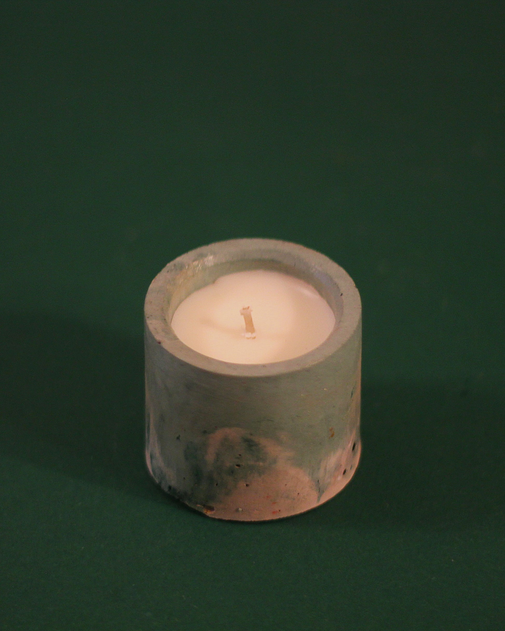 Ručna svijeća u betonskoj posudici s mramornim uzorkom u toplim zeleno-bijelim tonovima. Premaz je zlatnog sjaja.