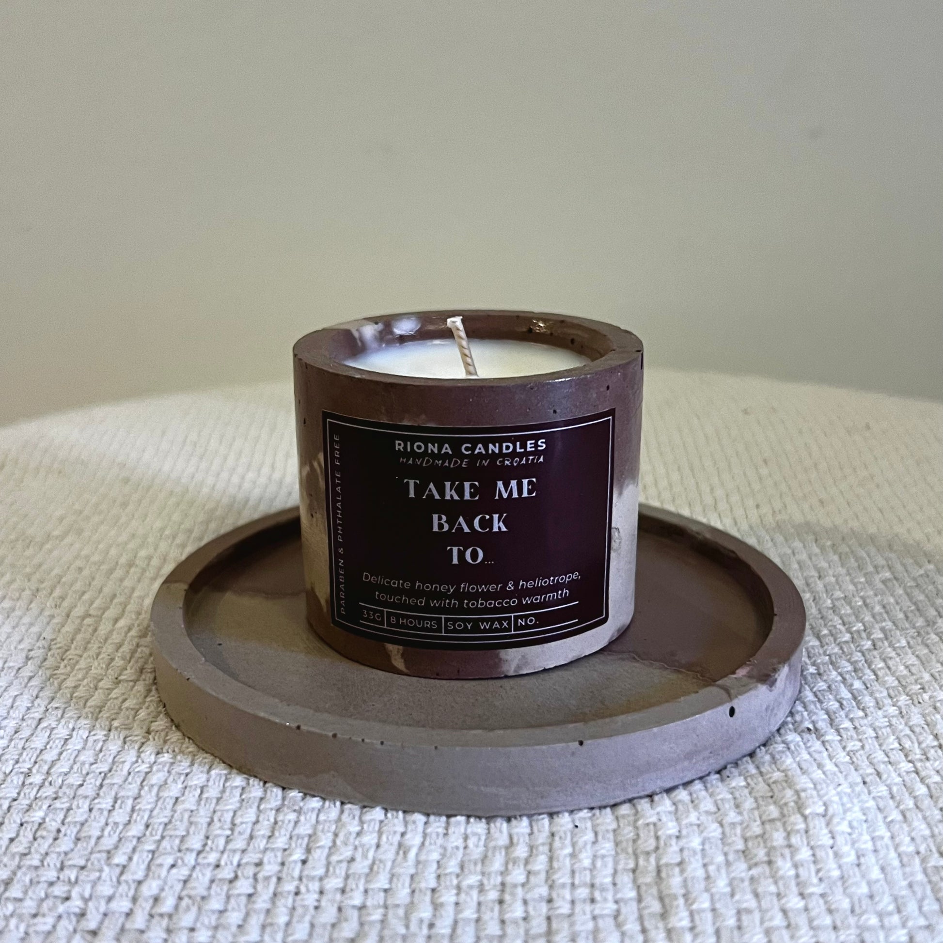 Jesenska betonska svijeća spaja prirodan izgled ručno izrađene posudice i tople mirisne note meda, slatkog badema i vanilije.