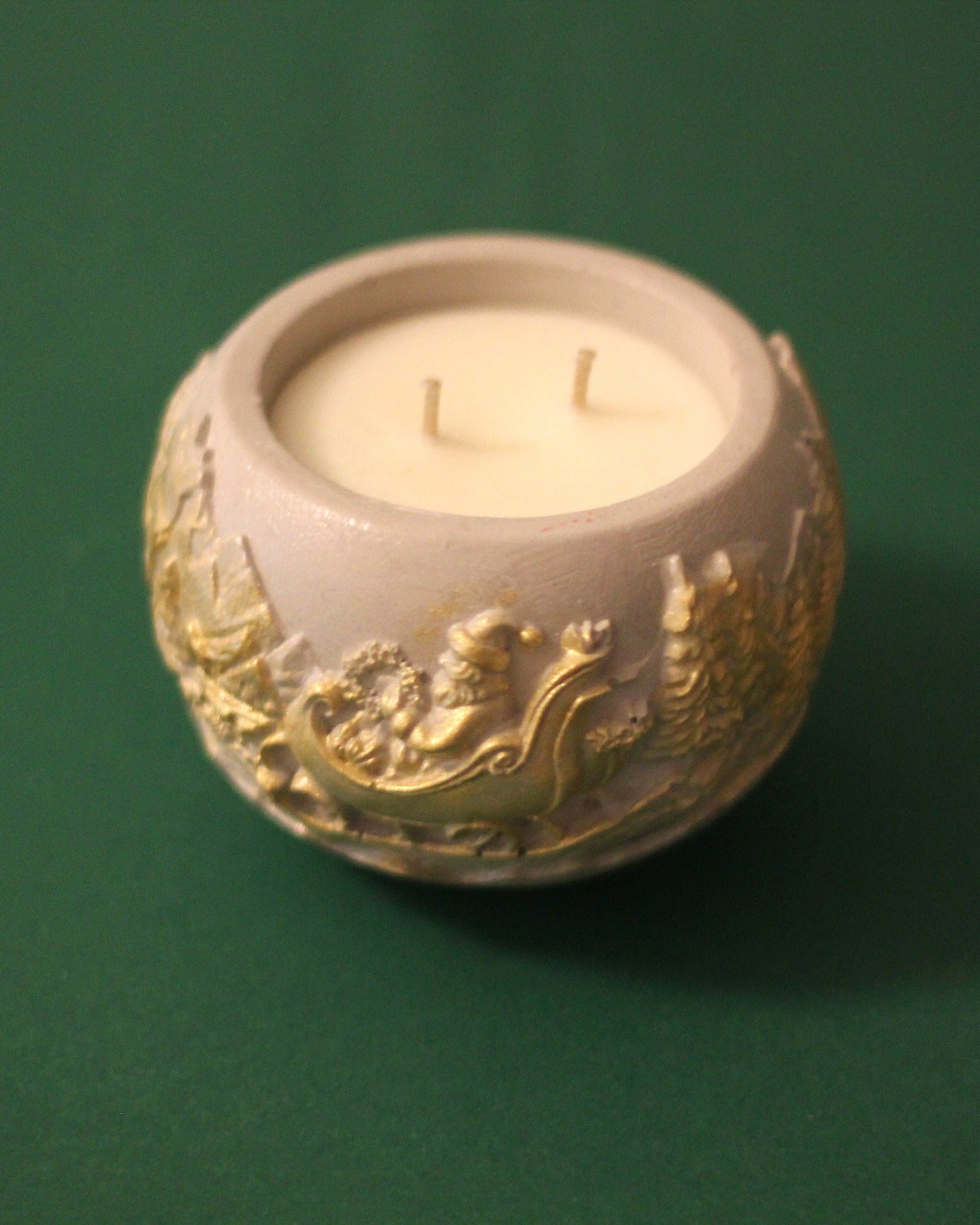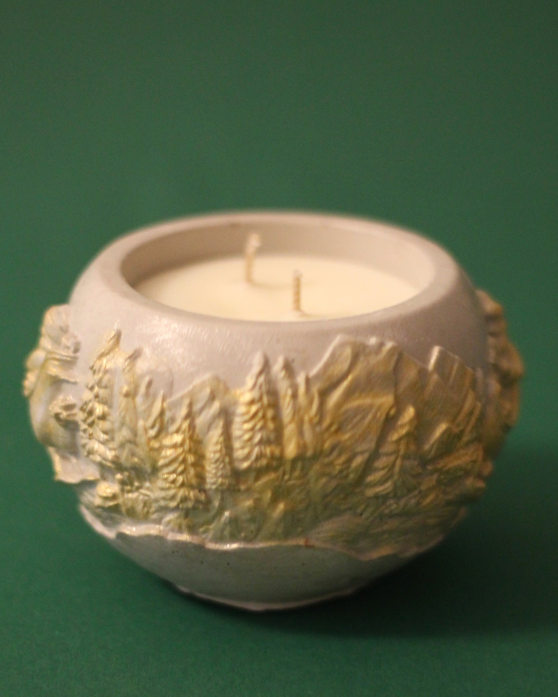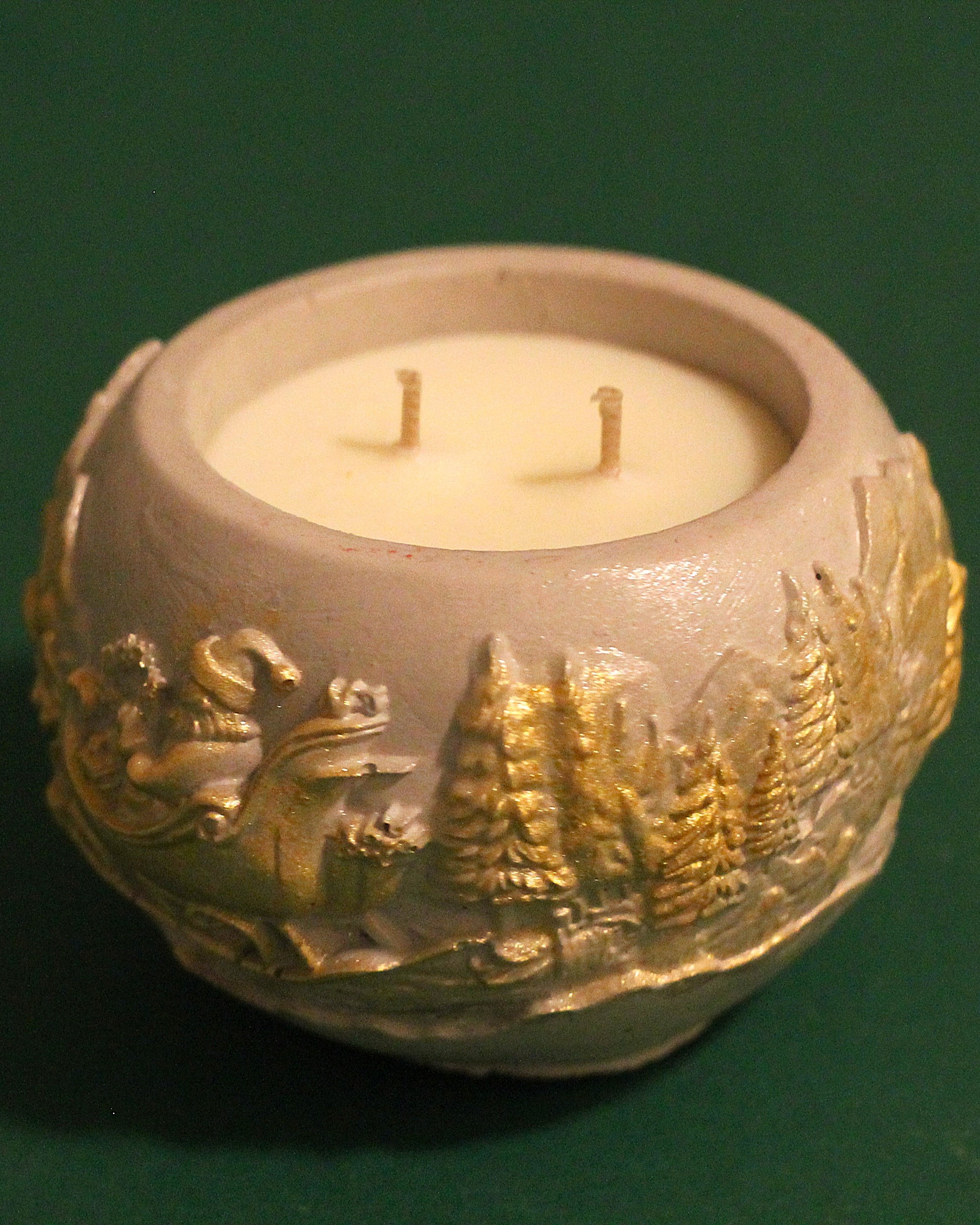 Ručna svijeća u betonskoj posudici s reljefnim 3D zimskim motivima, ručno pozlaćenima na izbočenim dijelovima.